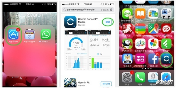 首先,到手機中的APP store,搜尋Garmin connectTM mobile,即可免費下載。下載後可以看到Connect的手環圖示。