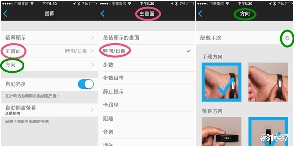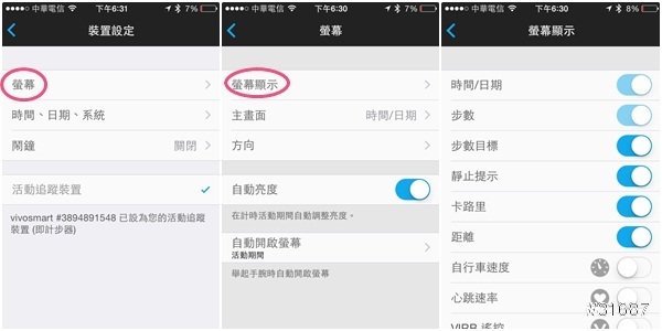 裝置設定→螢幕→螢幕顯示:從螢幕顯示的設定裡面可以設定你在手環上想要看到什麼資訊,並且可以把不想要看到的資訊取消,可以更有效率地從手環讀取資訊。