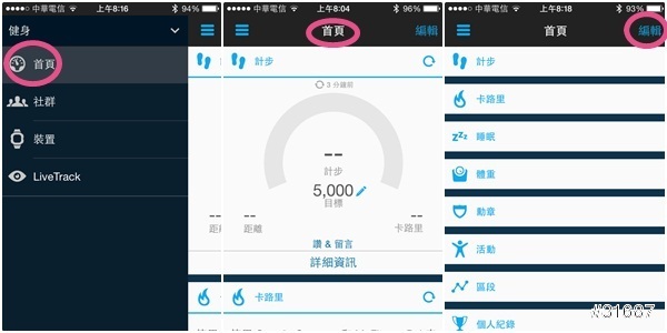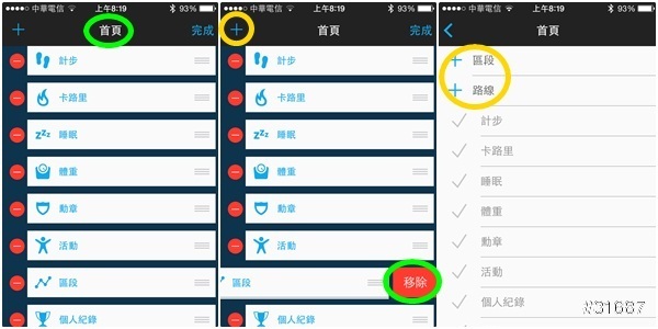 從首頁地方點入,可以看到目前手環內的所有紀錄事項,可以點選右上角的編輯把不需要的紀錄移除(綠框框),也可以點選左上角的+符號把它們再加入(黃框框)。