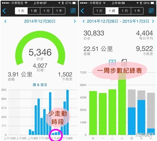 餵完奶、拍完嗝之後,我索性就會一直坐著懶得動,戴上Garmin vivosmart健身手環之後,就像有個教官隨時在旁邊一樣,會用震動的方式提醒我該起來動一動,卻不會打擾到睡在懷中的小寶寶!!藉由統計圖表可以進一步了解自己在一天當中的什麼時段比較少走動,以及得知週/月/年的步數紀錄和累計成果。