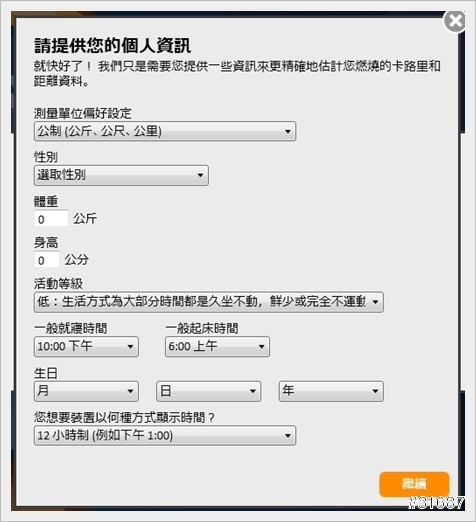 接下來要提供個人資訊,讓Garmin系統幫我自動計算活動量、燃燒的卡路里和目標。