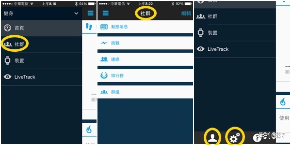 在Garmin Connect中可以利用左上角的選單來做手環的系統設定並且回顧自己的各項運動紀錄。同樣的設定也可以在手機上面執行,下面就以手機設定來做更詳細的解釋。