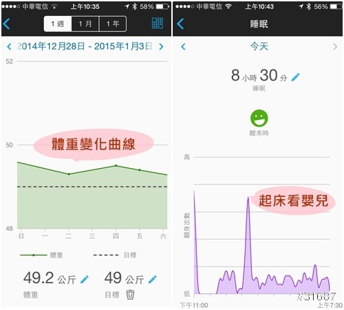 除了上述的五大優點之外,還可以記錄每日體重變化,時時督促自己要往虛線的目標前進!!也可以記錄自己的睡眠品質唷~而且一次充電可以使用至少6天,讓紀錄不中斷!!