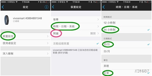 裝置設定→時間、日期、系統:可以設定想要呈現的時間格式、日月順序和距離單位。同時,手環也可以設定鬧鐘,提醒自己幾點要起床了!!
