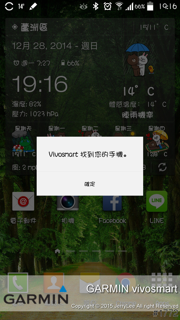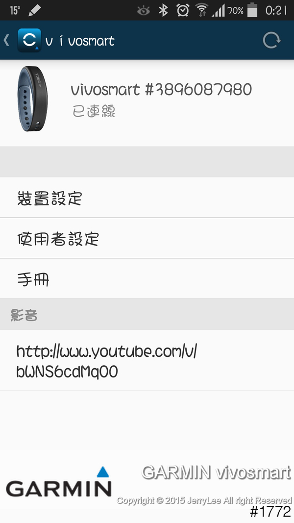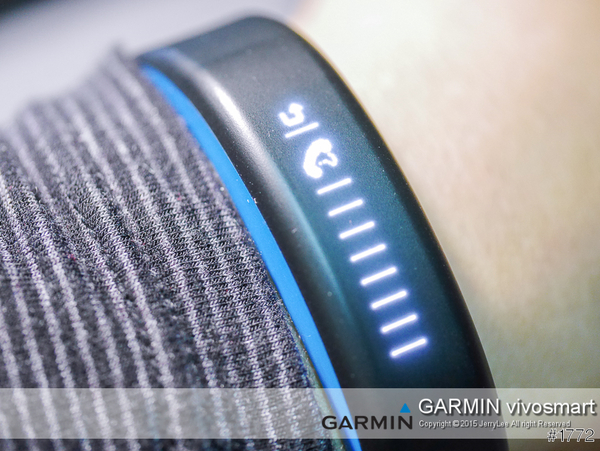 在生活上,因為有時候手機放在桌上,所以爾偶會有漏接電話的時候,但是配戴Garmin vivosmart智慧運動健身手環之後,電話、簡訊、email、LINE和臉書通通都可以隨時follow,永不漏接,電話不知道放哪去時,也可以使用找電話方式去尋找手機位置,實在是太便利;這幾天使用下來因為有使用提醒通知,所以使用大約5天左右就會跳出電池沒電訊息,體醒該充電了。