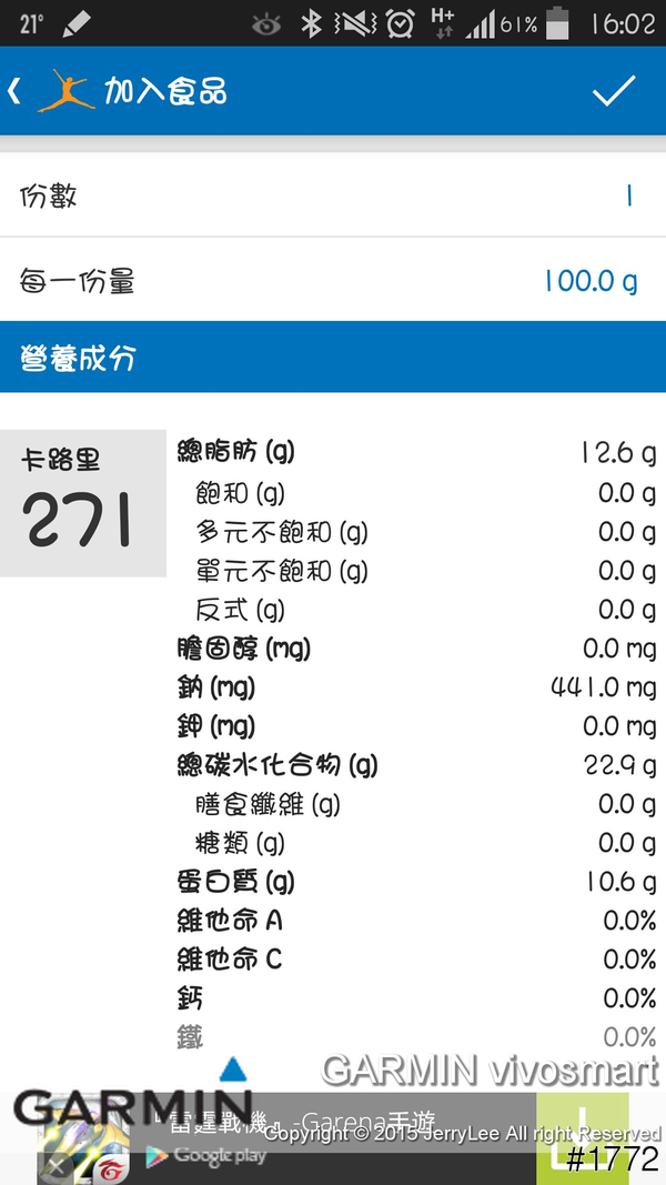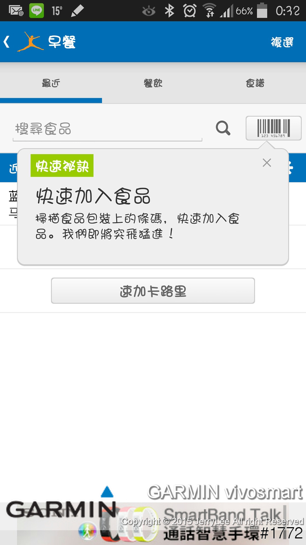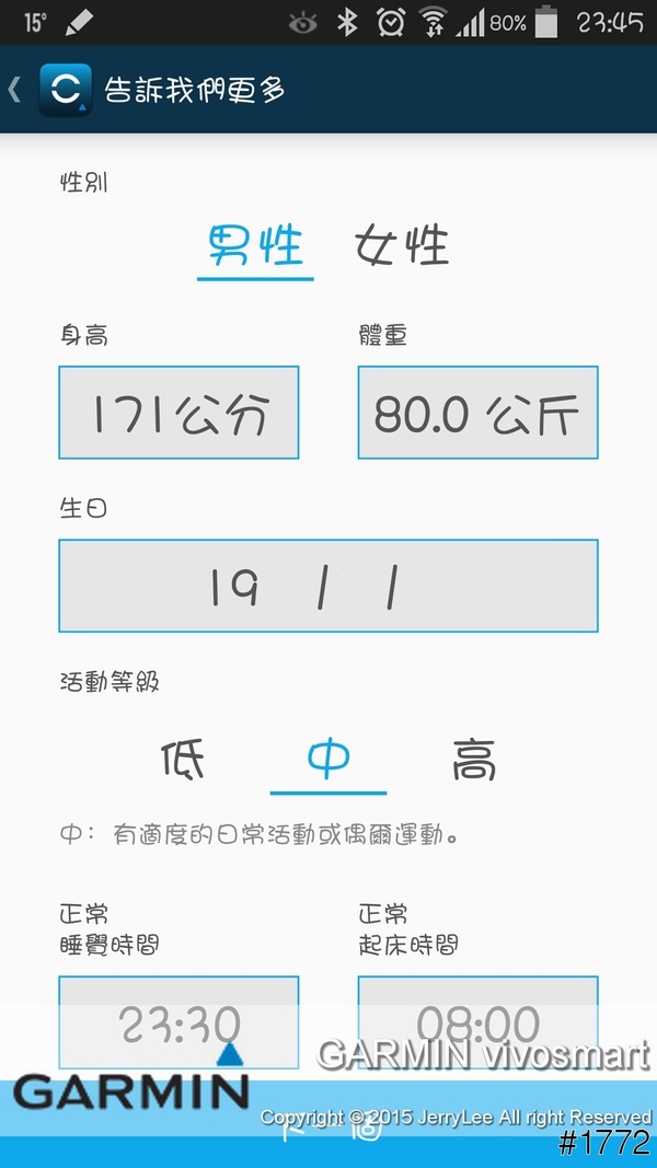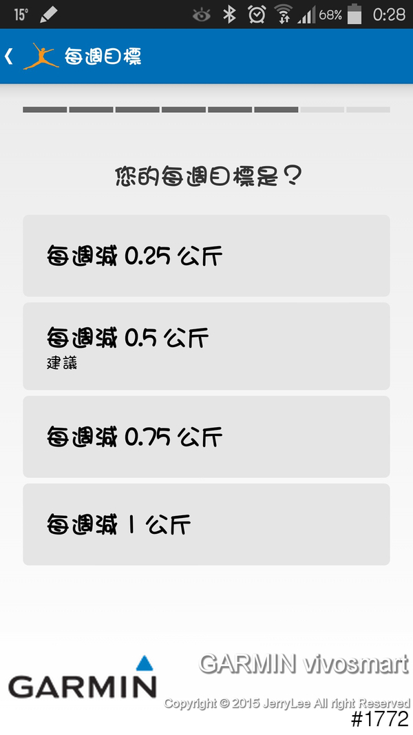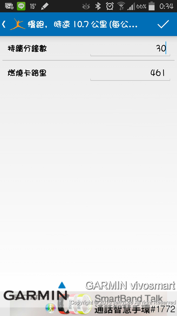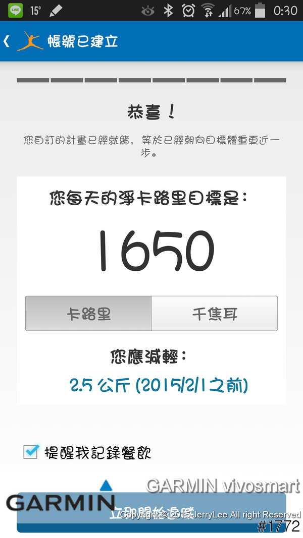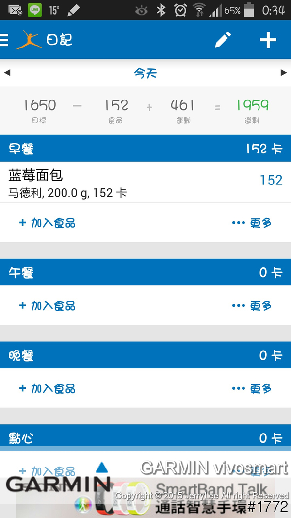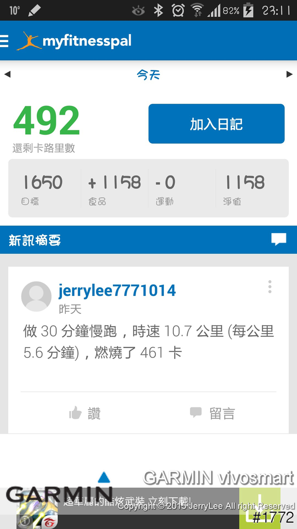 最後有了Garmin vivosmart智慧運動健身手環、Garmin Connect和MyFitenessPal三管齊下之後,對我的飲食與運動有了莫大的變化,看到食物之後,都會心理設想大概是有多少卡路里?那我又需要多少運動量才能消耗呢?而我在短短一週時間內,飲食的控制與運動體重有稍微降低2公斤左右,希望有機會能夠繼續努力往目標向前邁進,不過還是要時常保持運動習慣才是正確的方式,最後感謝Garmin給我這次很好的體驗。