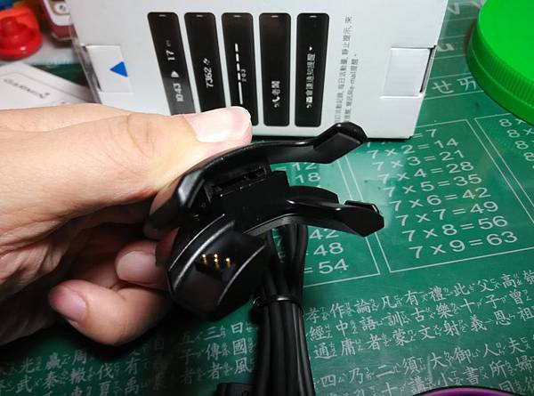 ▲手錶有金屬接面的那面對準後夾住,再插到電腦或USB充電器上即可開始充電。