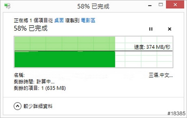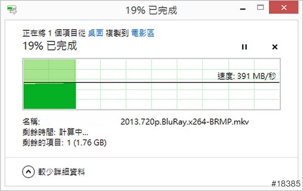 有時會下載一些新的影片,但要分類,所以會先下載在SSD內,下載好了再移到SSHD內,拷貝速度很奇怪,一開始從3~4G跑到最後在7~8XMB左右結果,每次拷貝1~2GB的檔案大約都只花幾秒鐘,感覺很快,也為了測試SSD拷貝到SSHD的速度,反覆拷貝了幾次1~2GB的電影檔案過去,速度都在幾秒之間,且小弟發現同一個檔案若在SSHD內刪除再拷貝過去,有時秒拷完成(小弟猜是因為在SSHD的8G SSD內仍暫存有該檔案的關係)。