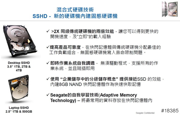 別以為只是SSD結合了HDD,在Seagate人員講解後,小弟才知原來SSHD還有自我學習技術(Adaptive Memory Technology)將最常用的資料存放在快閃記憶體內,加快讀取速度,現場擺的實機馬上測試開機時間長短,Seagate人員指出在重灌完系統後開關機約莫三次,自我學習技術便會自動將所需資料放在快閃記憶體內,縮短資料儲取時間,打個比方,之前開機時間可能要30秒,經過SSHD自我學習技術後,開機時間將能達到20~21秒左右!!