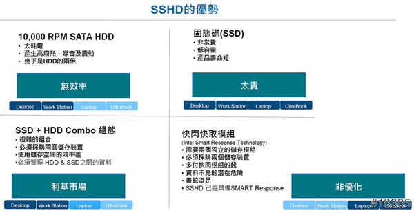 使用SSD配合一個大容量的HDD,這樣子可以得到快速使用系統的優勢,但對於軟體、遊戲等,你可能還是必需安裝在大容量的傳統硬碟,所以硬碟速度還是整機瓶頸所在,當然啦,你可以費心架構Intel Smart Response Technology,這樣效能會增加一些,但不是每個人都會,也不是每塊板子都支援,且這樣要兩個裝置,而SSHD只要一個即可得到如此的效果!