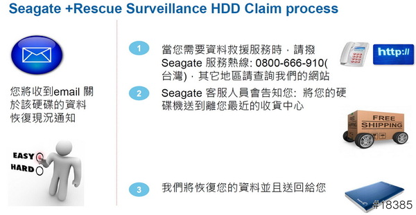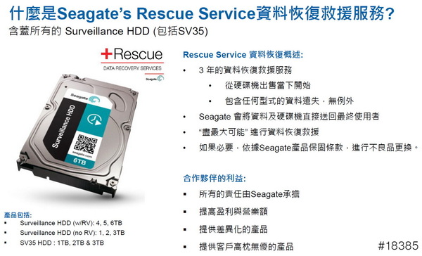 最後說到了Seagate SRS資料救援服務,講到此、我真不敢相信自己的耳朵,Seagate居然開始要自己做資料救援服務,重點是只要買它們的產品上有「Rescue」標誌的產品(目前是說在監控與NAS專用硬碟上才有),在三年保固期內發生非人為損壞,便可以寄到Seagate台灣服務處請他們幫忙把資料救回來(不是百分百保證一定把資料救回,且只有一次免費)。