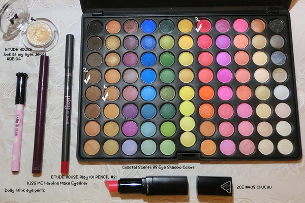 另外還要準備一個金蔥色的眼影,以及不能缺少的「黑色眼線筆」、「紅色眼線筆」和「粉色系唇膏」。
