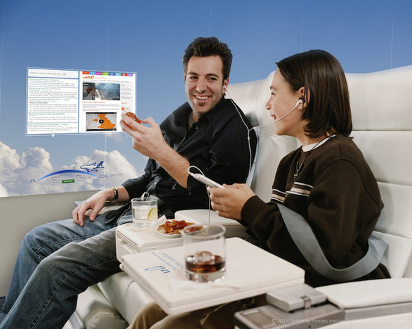 沒有玻璃窗的飛機除了上述的優點外,還有機內的空間也會因此而增大喔!這對只能坐經濟艙的我而言,真的是一大福音啊!雖然就算是廉價航空,我也因為腿比較短的關係,所以沒有覺得位子狹小過=_=