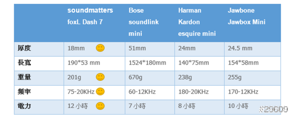 從上面的比較表來看無論是厚度、重量、響應頻率、電力都優於同級品,長寬與同級品相當,體積更是音質較佳的Bose soundlink Mini的1/4 。