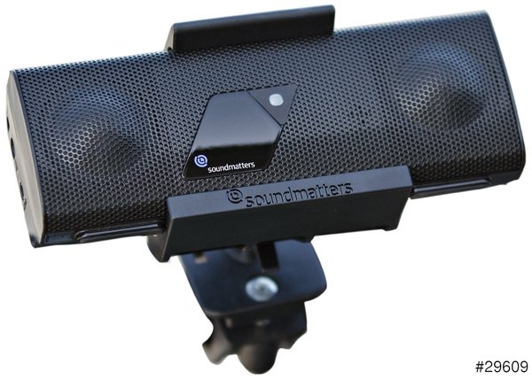 在我小時候常看到有人把機車加裝喇叭,那刺耳的音樂與機車聲夾雜,飄著一股正港的台味,哈哈,言歸正傳,在歐美的人很習慣騎腳踏車,因此他們也會把喇叭裝在腳踏車上,Soundmatters有出專屬的夾具稱為Soundmatters BKMT 2 Bike Mount,可以牢牢鎖在腳踏車上,一邊騎車一邊撥著音樂,好不拉風啊~