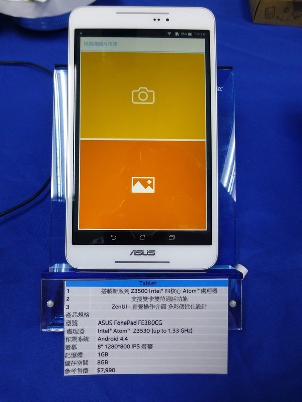 這一款則是較為平價的機種:ASUS FonePad FE380CG,採用與上面二款不同的處理器,為Intel Atom Z3530。