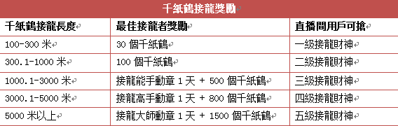 3.千紙鶴接龍總榜排行前三的藝人,可分別獲得開播後20分鐘首頁排序提升88位15天、10天、5天;