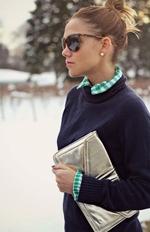 綠色的襯衫看起來有點復古,不過搭上深色的毛衣反而會有可愛甜美的感覺。