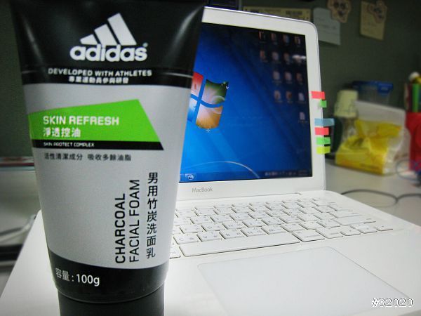 ▲ adidas男性淨透控油竹炭洗面乳和我的小白合照。