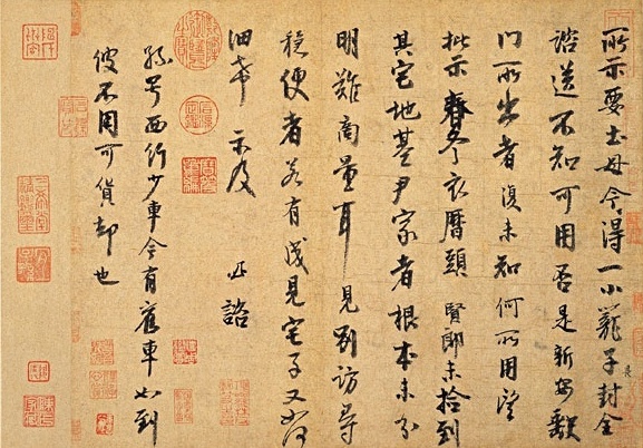 創作背景:李建中友人向他取要“土母”,“土母”現今的推測應是礦石之物。文中內容提及,李建中也不清楚友人取要“土母”要做什麼,並請對方說明清楚,但他已幫他準備好一小籠子了,是河南新安縣缺門山所產的。此帖是李建中和友人平日傳遞瑣事的往來書信,從內容的隻字片語中推測,應是友人兒子欲購宅之事還未辦妥,希望能跟李建中再說明清楚些。文末並建議,孫號將要西行,若舊車不用可以賣了。