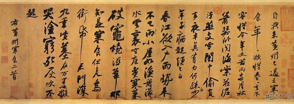 創作背景:北宋時期有位名叫邵子中的人,他得到了一段非常珍貴的“蜀素”,“蜀素”在北宋時期為四川地區所製作的絲綢,其制作講究,質地非常精良。他尋求了非常多的書家,欲在“蜀素”上留下墨寶,後來此段“蜀素”傳至了子孫三代,因其非常珍貴,加上絲織品滯澀不易書寫,竟無人敢在上面提書,後來展轉到了湖州郡守林希手上,他收藏了20年後,林希邀請米芾遊覽太湖旁的苕溪時,林希取出蜀素卷請米芾書寫,米芾當仁不讓,一口氣寫下了自已創作的遊記和送行的八首詩。