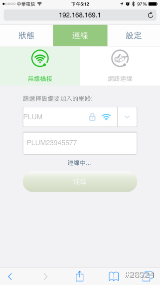接下來就是打開手機上的瀏覽器,輸入192.168.169.1,登入設定畫面,選取登入,選擇可使用的無線橋接或是網路連線,只是GINA家中是無線,所以就依無線橋接來做設定教學^^