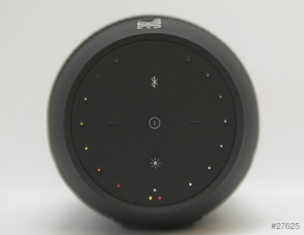 產品左側JBL Logo處配置所有功能按鍵;包含電源開關、音量大小聲調整、情境燈模式切換、藍牙配對,以及七段亮度調整與七種獨立顏色調整鍵。至於產品右側為無線NFC感應配對區域,產品標籤貼紙也黏貼於此。