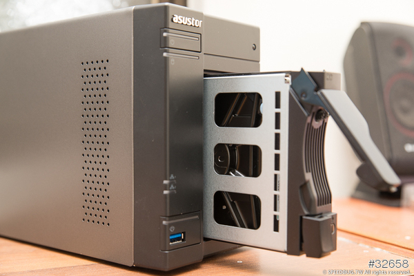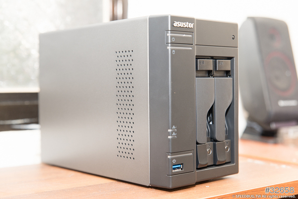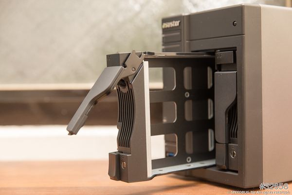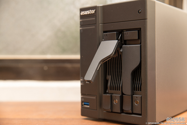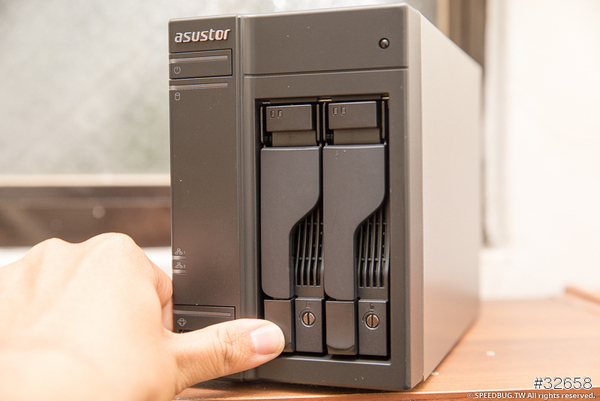 AS5102T 為 2Bay 機種,可同時安裝兩顆硬碟,硬碟的安裝也相當簡單,只要輕輕壓一下下方的卡榫就可以開啟硬碟抽取盒。