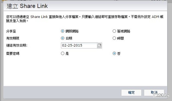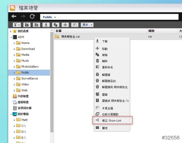 除了自己存取檔案之外,有了 NAS 你可以用更方便的簡潔的方法分享資料給你的朋友!只要在檔案總管內找到你要分享的檔案,按下右鍵選取「建立 Share Link」便會即時產生一個檔案下載連結,連結還可以加註有效時間和設定密碼提高安全性,以防連結遭盜連。
