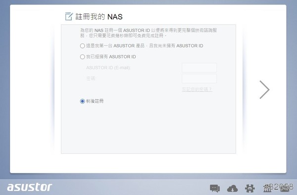 NAS 初步設定完成後,為了有更完整的體驗,建議大家直接上網註冊一個 ASUSTOR ID 帳號。