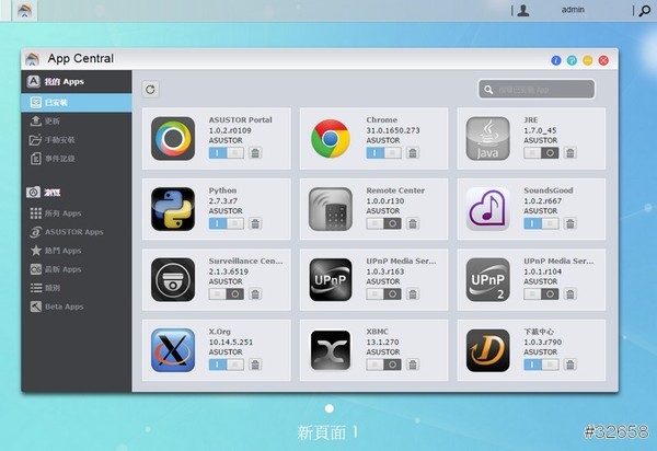 打開 ASUSTOR 提供的 App Central,裡面提供了許許多多的 APP,除了一般的多媒體資料存取外,還可以用來架設自有的網站、用 WORDPRESS 建構 BLOG、甚至是專屬於你自己的網路相簿,這些都是在這裡「一鍵完成」阿!