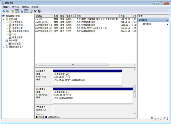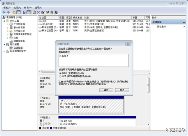 來看看接上電腦之後進入Windows,到電腦管理>存放裝置>磁碟管理。就會出現要初始化磁碟的訊息,這裡要選擇GPT的格式,對於大容量硬碟這樣才有辦法完整辨識使用。
