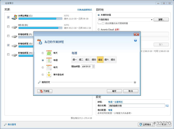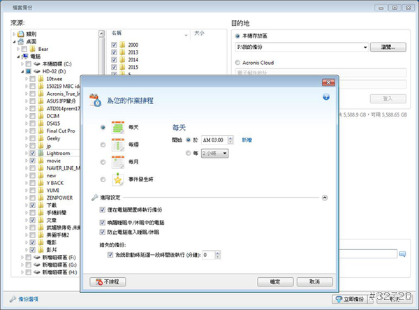 在左下角有一個時間排程的設定,點選之後就可以自己選擇你要自動備份的時間。因為照片每天都有機會會新增,所以我選擇了每天備份。備份時間就設定在半夜的時間,通常那段時間也不太會用電腦,所以拿來備份剛剛好。