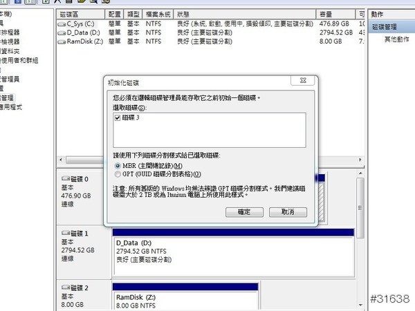 開機後,系統馬上偵測到有一組新的磁碟機,所以我們這裏新增一組磁碟