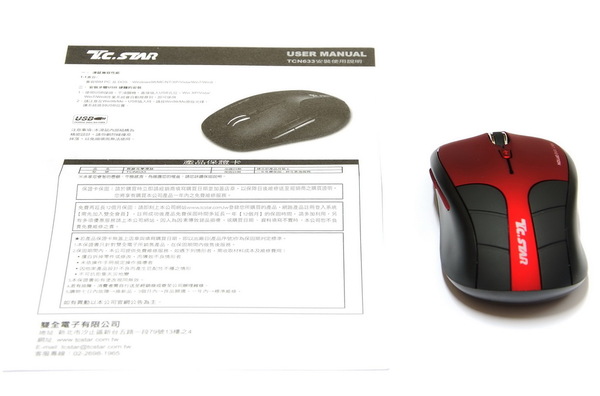 裡面內容物有簡易的說明與保證書一張與TCN633滑鼠紅色本體一隻