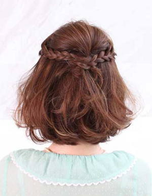 利用側邊頭髮綁麻花辮,再將兩邊辮子往後收攏