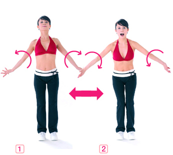 2. 鼻子慢慢吸氣,一邊利用手掌向外翻,帶動手臂扭轉,如圖1