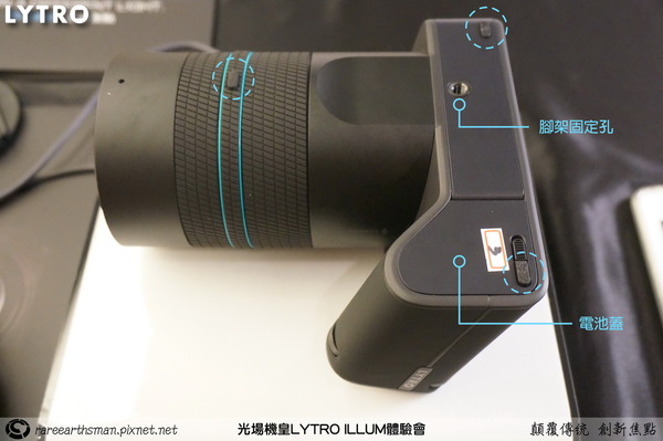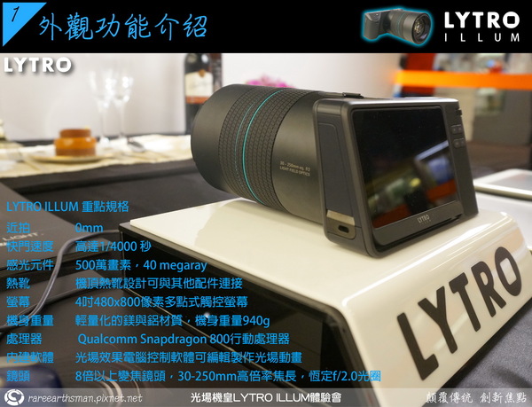 ▲LYTRO ILLUM的機身功能介紹,機身左側打上30-250mm eq. f/2 Light Field Optics;鏡頭後端的是變焦環,用來選擇哪個焦段;前方的是對焦環,負責將對焦點移動到哪一個距離上。