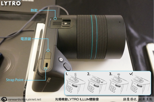 ▲LYTRO ILLUM機身上方中央處為熱靴的位置,右方握把上方有電源鍵及Strap Point,至於Strap Ring的組裝方式也很簡單,照著右下角的圖示很容易裝好的。