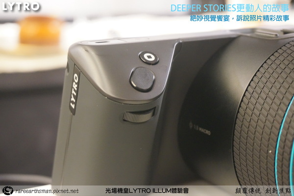 ▲LYTRO ILLUM右側的握把上方,有印上LYTRO的"O"Logo的是LYTRO按鍵,按下後會進入LYTRO模式,接著按下前方的快門鍵後就會拍照;快門前方的是前轉盤。