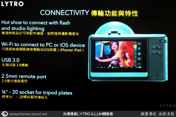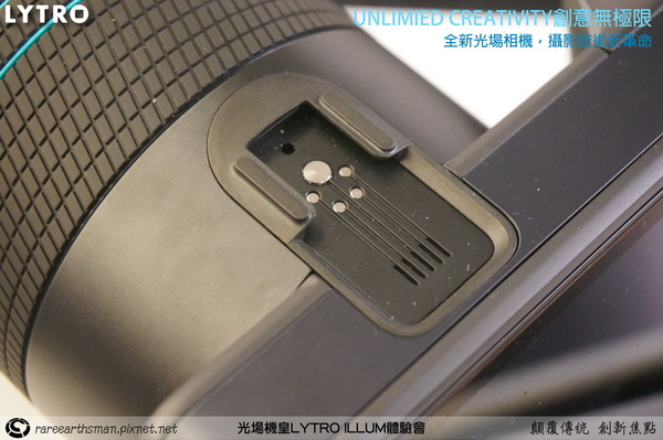 ▲在傳輸方面,LYTRO ILLUM光場相機機頂有搭配熱靴,可以與散光燈等配件做連接,可以透過WIFI連接電腦與iOS設備,支援USB3.0傳輸,2.5mm遠端遙控,標準1/4"-20螺紋腳架連接孔。