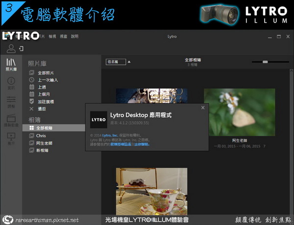 ▲Lytro Desktop這套軟體是免費的,有Windows及Mac的版本,我使用的是Windows的版本,版別是4.1.2版;這是一開啟軟體後的顯示畫面,中央的小視窗是查詢說明/關於Lytro Desktop所顯示的資訊;特別注意的是,Lytro Desktop這套軟體只能接受Lytro自己相機的專用檔案,如果是一般的jpg檔是無法輸入進來調整的。