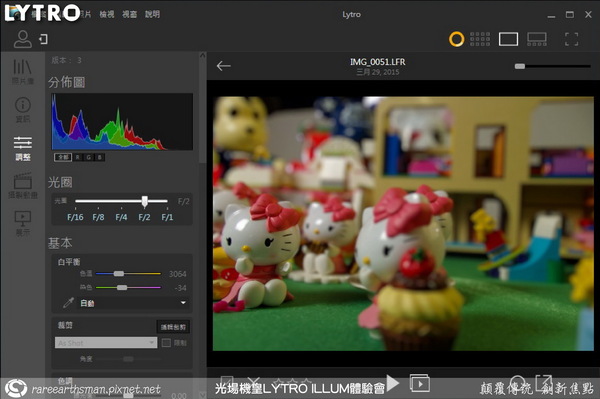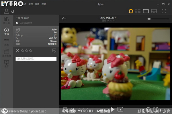這次在法雅客的LYTRO ILLUM光場相機體驗會,感受到了LYTRO ILLUM光場相機功能的強大,透過對焦環的轉動與螢幕上的波形協助,讓我可以很輕鬆的調整到適當的焦點,也真的讓我體驗到先拍照後對焦的樂趣,體驗會後在自己電腦前點來點去,看是否可以找到更多的對焦點,有時在一張隨意拍攝下來的照片中發現裡面的一個小公仔,沒想到也可以對到焦耶,而且在後製上也可以任意的調整照片的色彩資訊與光圈參數,讓當天拍照下來的照片變得更為細緻,色彩也更為飽和。