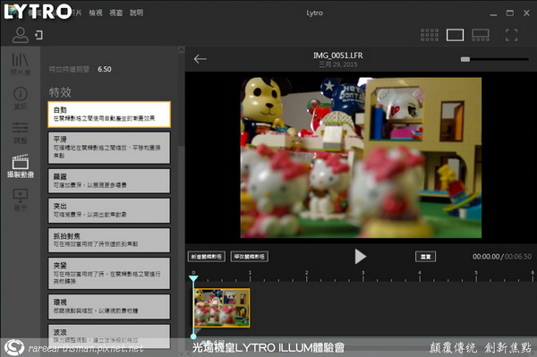 ▲Lytro Desktop的"拍攝動畫",一張照片怎麼可以拍成動畫呢?除了放大縮小外,透過視角的微調造成些為立體的感覺,眾多的功能可以讓一張簡單的照片加入一些動畫元素,也讓照片添加了一些故事性。
