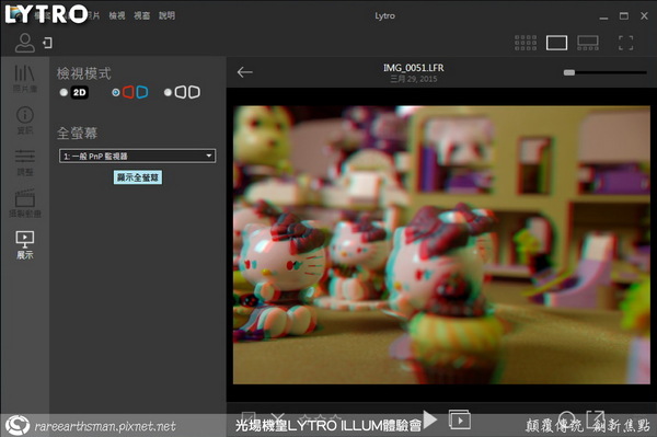 ▲Lytro Desktop的"展示"功能,有2D一般顯示、3D(紅色與青綠色)使用立體眼鏡觀看其立體感、3D(左右分割畫面)使用在3D電視上。