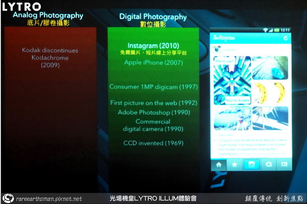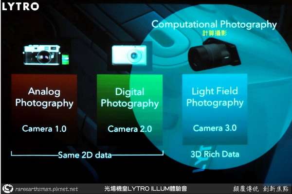 ▲攝影業界在儲存類型上的轉變,如果將底片或膠捲的類比記錄定義為Camera 1.0的話,使用記憶卡的數位攝影部分就屬於Camera 2.0,而這兩代的攝影都是屬於2D的攝影,也就是將相機鏡頭的畫面用平面的方式來記錄;而LYTRO Camera的技術屬於Camera 3.0,相機所記錄的資訊是3D的資訊,我們可以稱之為計算攝影。