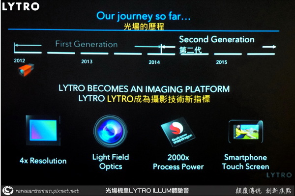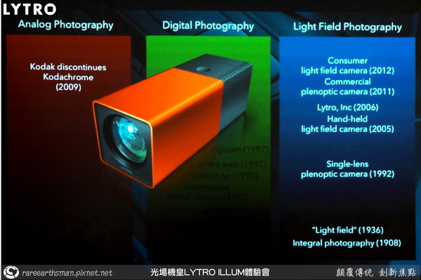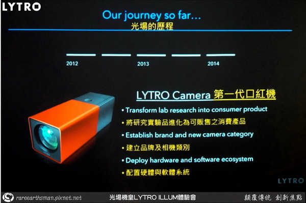 ▲光場的歷程,LYTRO在2012年首度推出了LYTRO Camera第一代的口紅機,將實驗室裡的技術推向可商業化的領域,然後創立了品牌及創造了新型態的相機類別,並配合相機設計了相對應在電腦端的後製軟體系統。