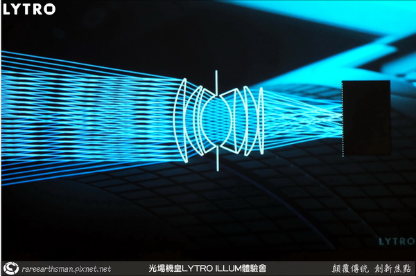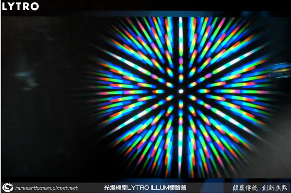 ▲一顆小小的Sensor透過燈光的照射,在顯微鏡下會顯示出這81顆小鏡頭,每顆都接收到光線,而且是每條光線都以不同角度的均勻照射,進而顯示出以鏡頭中央為中心,對外做放射狀的發散,最中央與最旁邊的鏡頭角度完全不同,所以LYTRO ILLUM光場相機可以記錄在有限角度下的些微不同角度的影像記錄,所以在動態影像下可以調整一點點視角,讓這張照片的動態影片可以看見一點點的物體側面,營造出一個立體的3D效果影片出來。