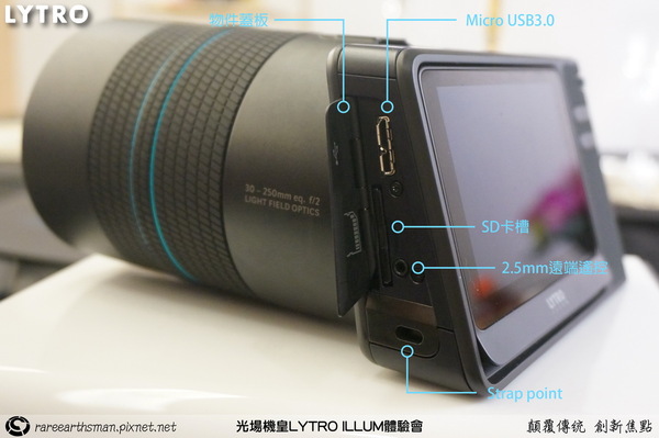 ▲LYTRO ILLUM機身左側的物件蓋板中收藏著相機I/O的部分,靠上方的是Micro USB3.0連接器,可以使用USB線來連接電腦;中間部分是SD卡槽,支援SDXC/SDHC,但是官網及現場工作人員並無法提供能支援多大容量的記憶卡,現場體驗的是32G的SD卡,據工作人員說,他們有客戶有使用64G的SD是也可以順利使用,這部分確切的數據就等原廠或代理商來更新了;另外SD卡槽旁邊還有一個2.5mm遠端遙控的插孔。蓋板下方也有一個Strap Point。