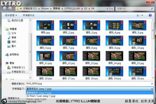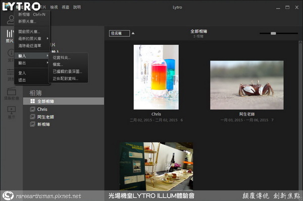 ▲使用記憶卡方式的LYTRO ILLUM檔案要先從檔案/輸入/從資料匣or檔案來做輸入的動作;輸入過的就會出現在相簿中;上面Chris&阿生老師的資料匣是我在軟體體驗時拜託工作人員Copy給我的檔案。